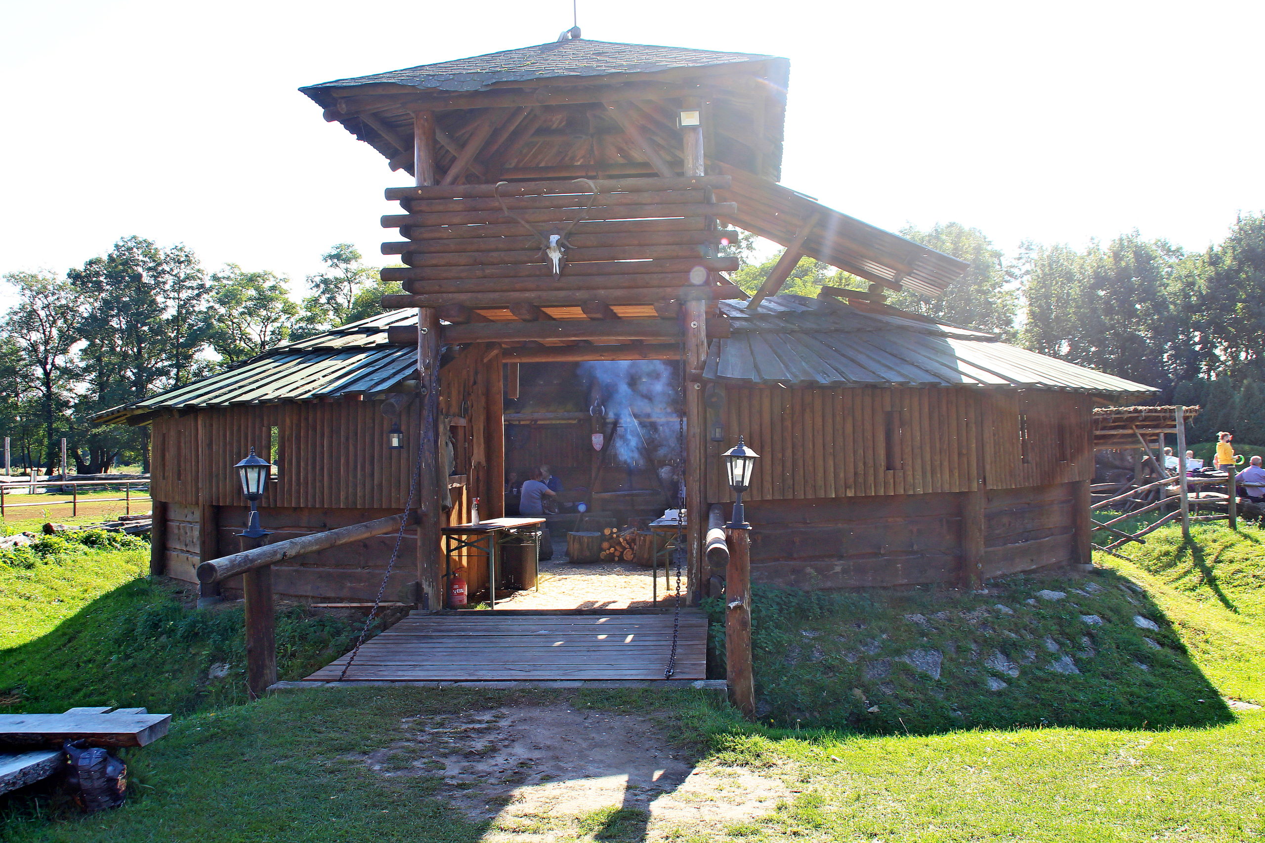 • ognisko połączone z pieczeniem kiełbasek, Plac zabaw mający charakter grodu rycerskiego z akcesoriami rycerskimi, zwiedzanie domu z bali modrzewiowych i poznawanie dawnego życia na wsi,