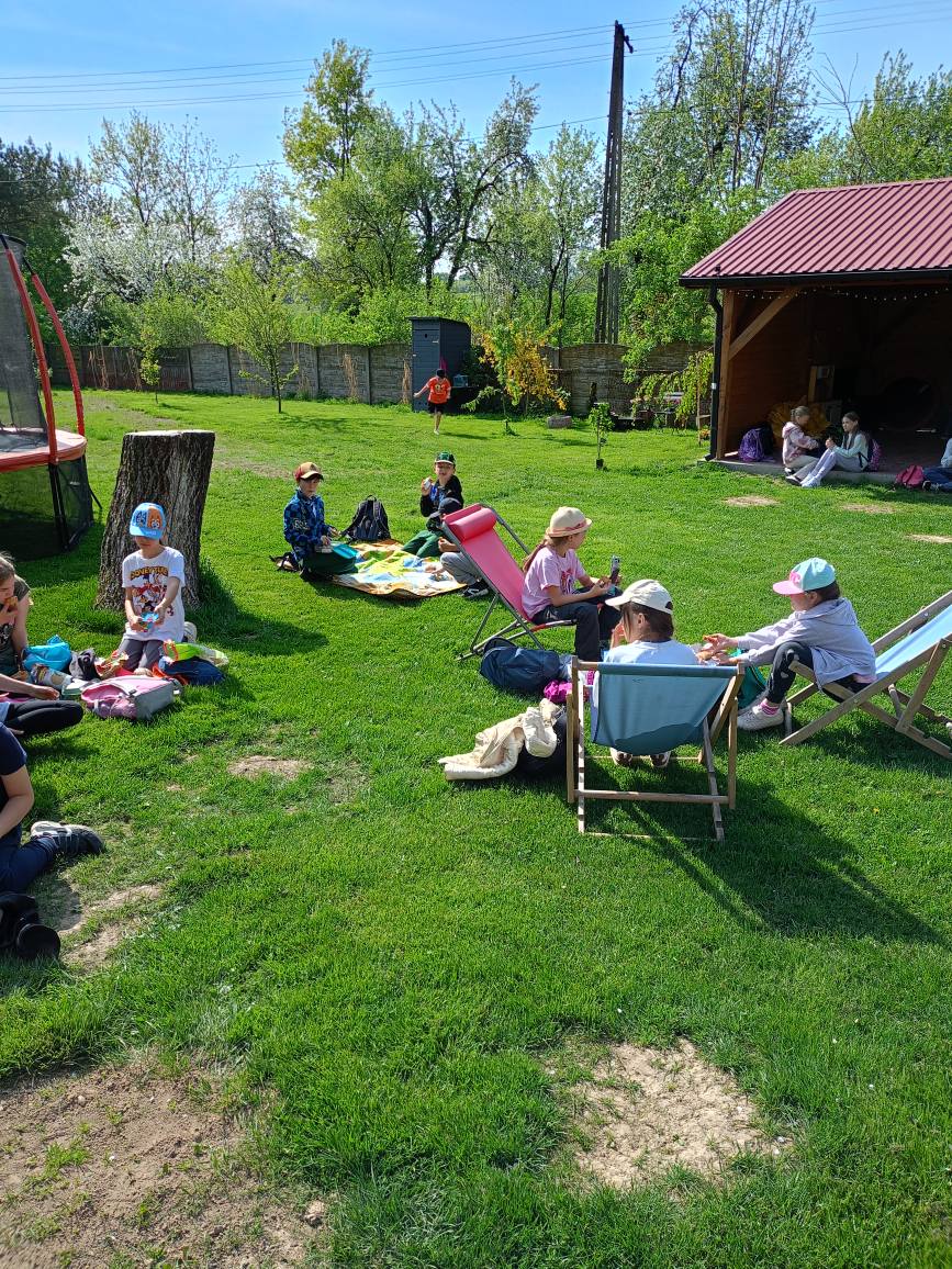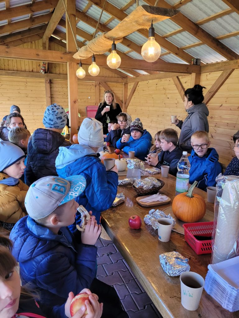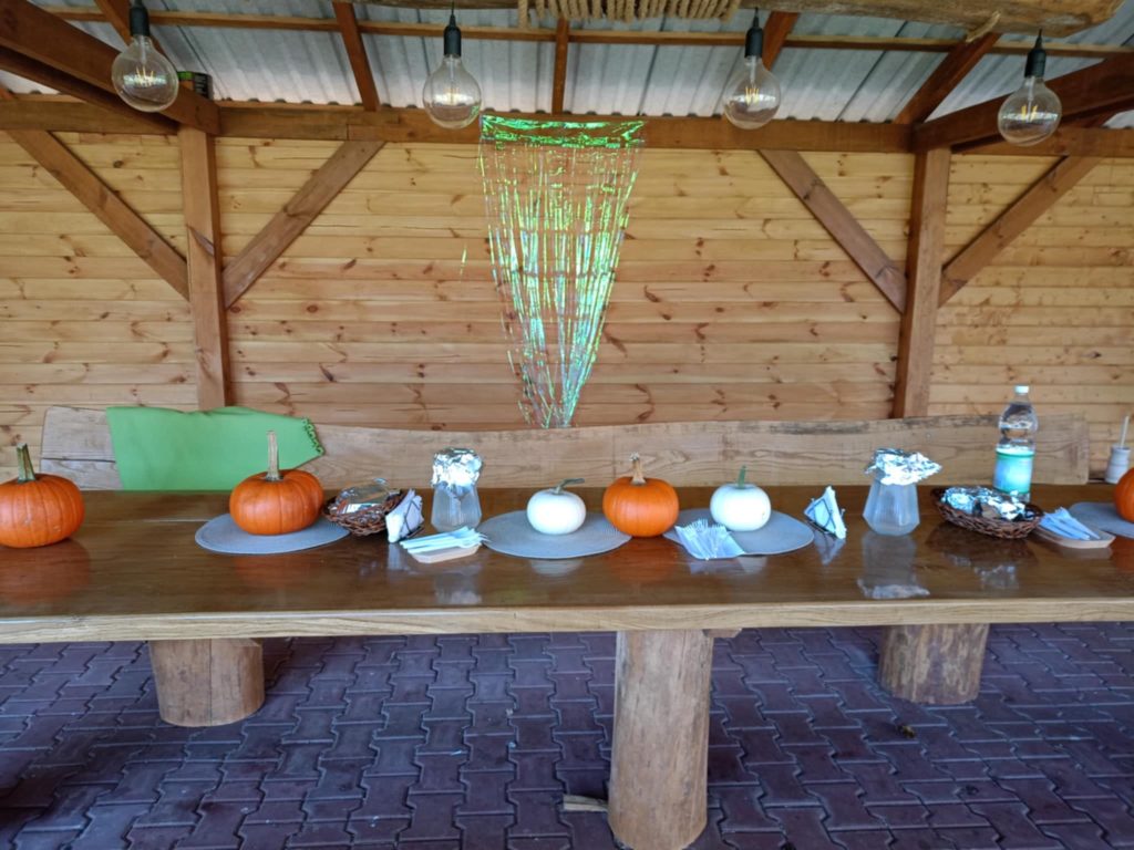 Na terenie gospodarstwa znajduje się zadaszona wiata pod którą można spożyć posiłek lub przeprowadzić warsztaty.