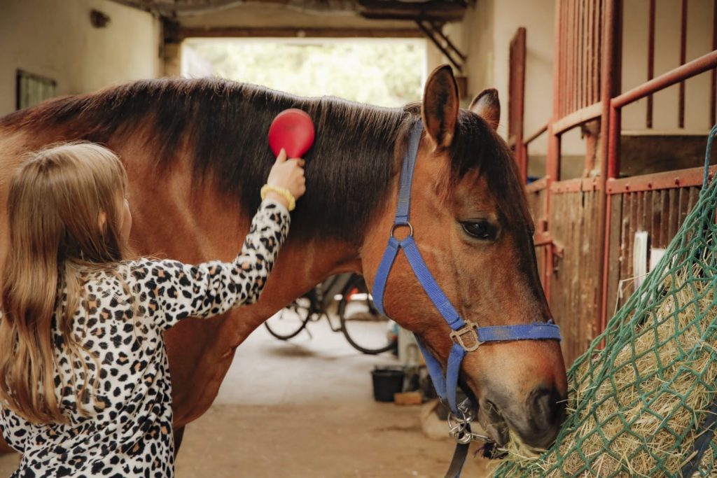 Podczas zwiedzania stajni opowiadamy, gdzie konie śpią, co jedzą, jak widzą i słyszą, a nawet... czy naprawdę śpią na stojąco! Uczymy, jak dbać o konia, gdzie przechowuje się siodła i czemu koń potrzebuje kowala.
