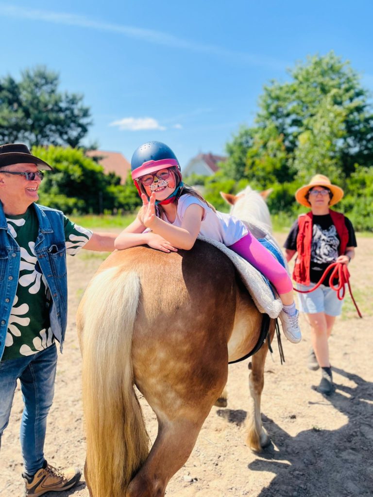Co dają gościom zajęcia z nami i naszymi zwierzętami? Przede wszystkim zmieniają naszą mowę ciała, która wprawnym obserwatorom mówi więcej niż słowa. Czasem wręcz im zaprzecza. Chcemy wydawać się silni, a mowa ciała nas zdradza. Mówi: jestem słaby, można mnie przesunąć, zignorować, zlekceważyć lub nawet zaatakować. Dzięki kontaktom z naszymi zwierzętami mowa ciała się zmienia. Wyprostowana sylwetka, pewny krok, śmiałe spojrzenie, zdecydowane, choć łagodne ruchy, spokój połączony z czujnością – wszystko to mówi: ze mną nie będzie łatwo, jestem liderem, wiem, czego chcę, wiem, dokąd zmierzam, przy mnie możesz czuć się bezpiecznie. Czego się uczę, wchodząc do końskiego świata. Uczę się stawiać granice. Uczę się używać głosu. Uczę się refleksu. Uczę się empatii i asertywności. Uczę się obserwować partnera i otoczenie. Uczę się wyciszać, panować nad ciałem oraz głosem. Uczę się precyzji w wyrażaniu swoich oczekiwań. Każdy popełnia błędy. Uczę się, jak sobie z nimi radzić. Uczę się, jak podnosić i obniżać energię. Uczę się wykorzystywać swoją ludzką inteligencję. Uczę się, jak być przywódcą.